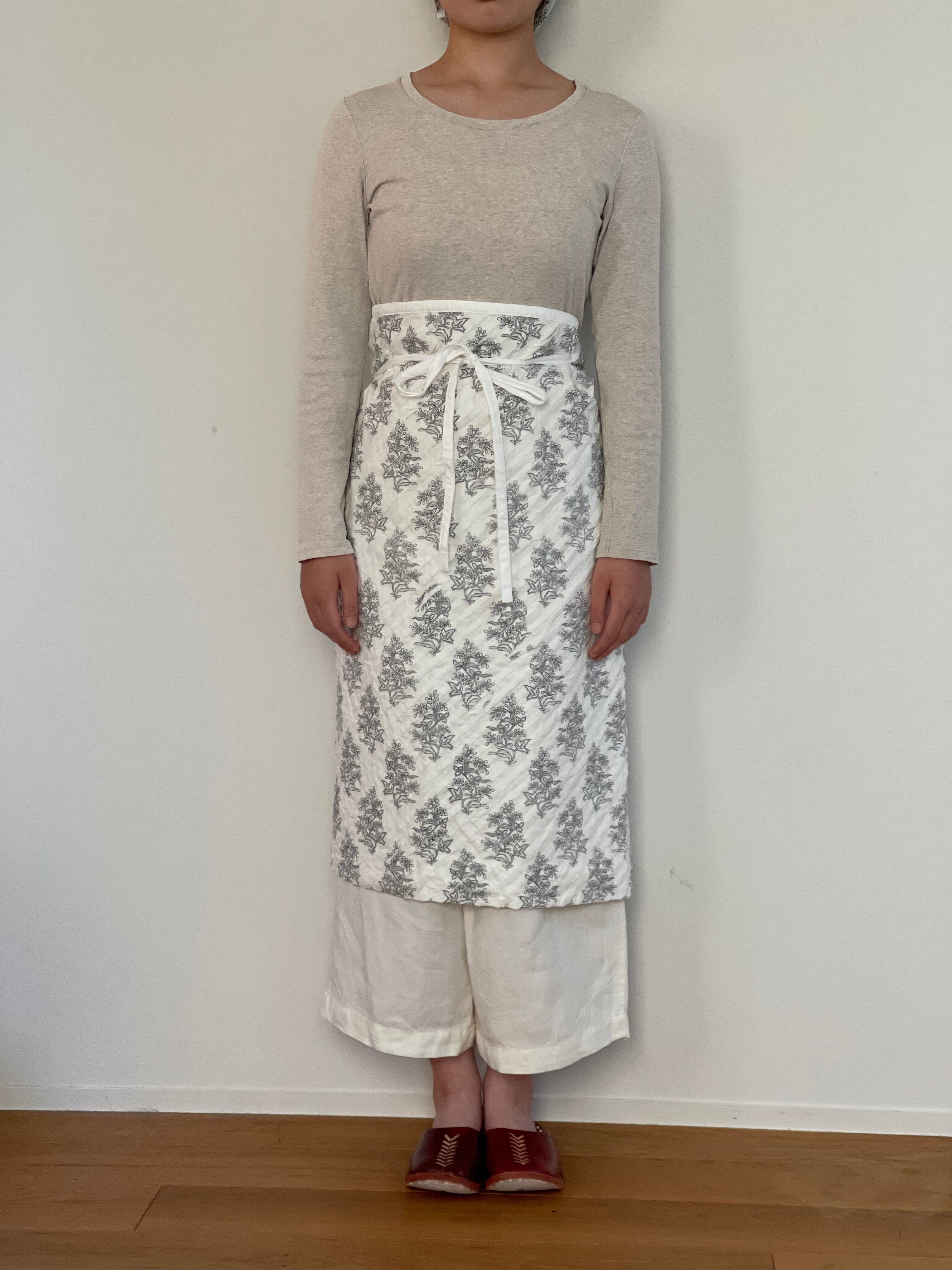 Tablier apron スラッシュキルトは、インドのジャイプールから仕入れたブロックプリント生地で作ったスラッシュキルトのダブリエエプロンです。重ね合わせた生地により更に立体感が出てそれぞれの個性を与えています。