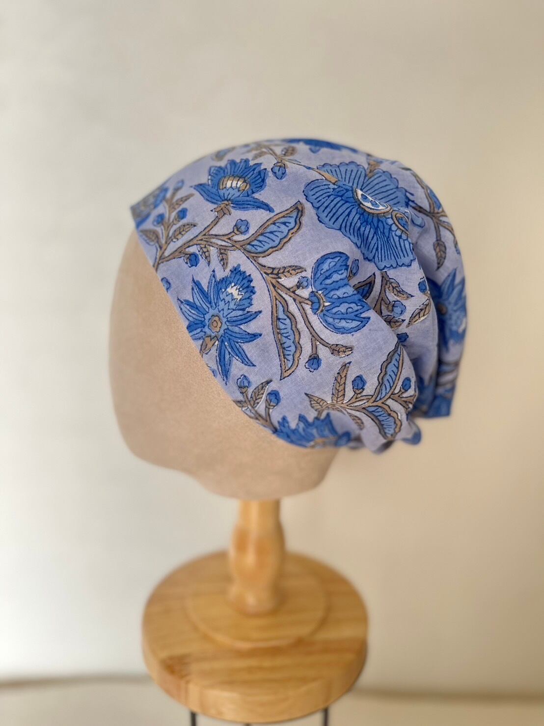 makimono blueflowerは、料理をする際や、作業時に頭に巻いて使います。こちらは、頭をもっとたっぷりとした生地で覆いたい、と言う料理家の友人からのオーダーから生まれた巻物
