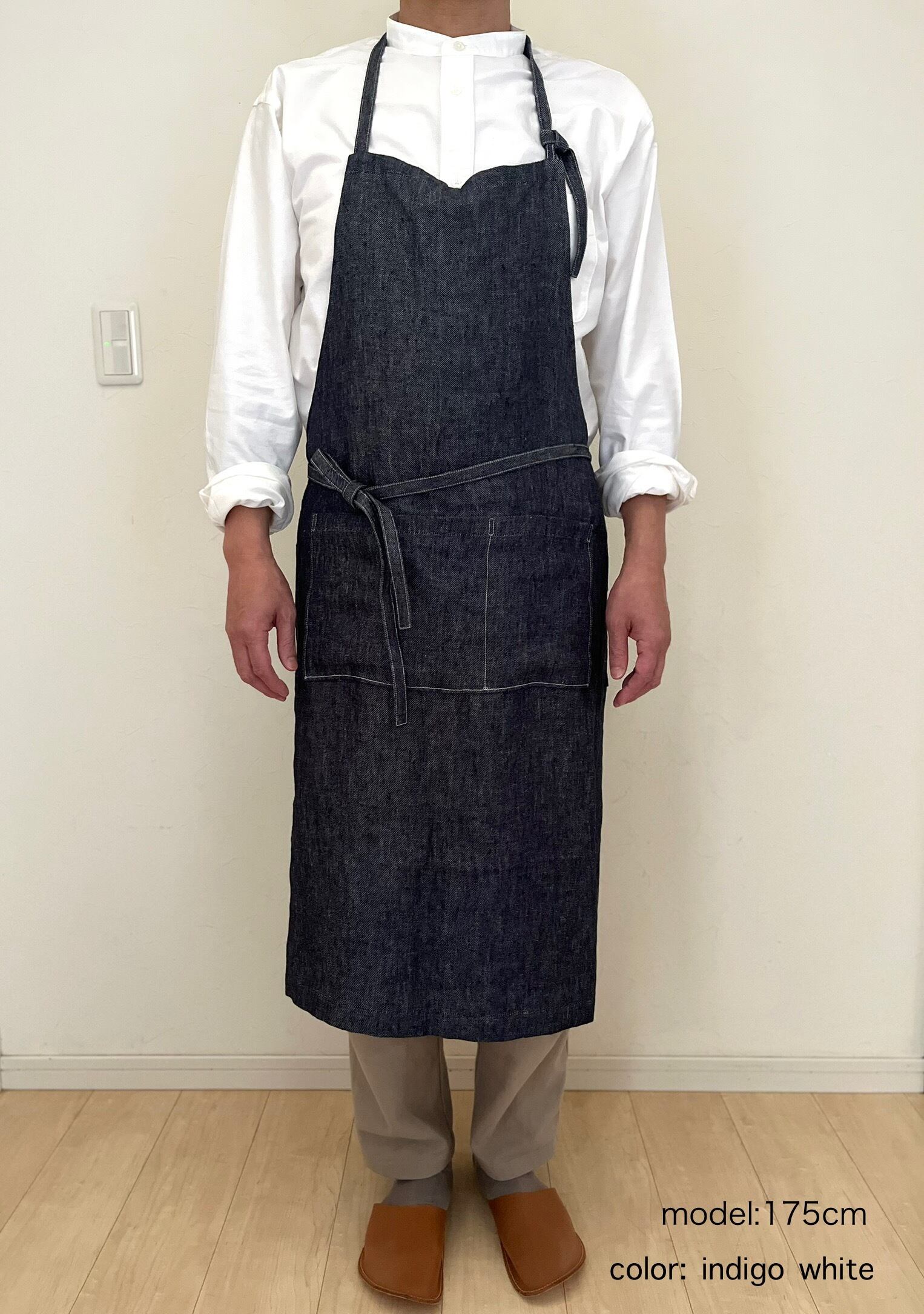深い色合いが魅力のインディゴブラックエプロン。上質なリネン100%素材を使用し、丈夫でありながら柔らかな肌触りを実現しました。